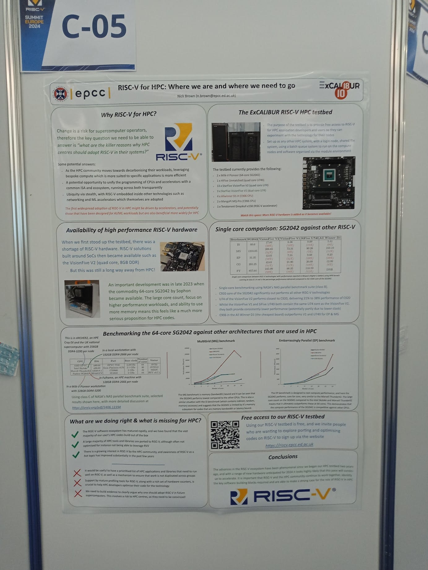 The H&ES RISC-V testbed also presented a poster RISC-V for HPC: Where we are and where we need to go which explored the current state of the art in RISC-V for HPC and detailed where we need to go as a community to help drive adoption of RISC-V for HPC.